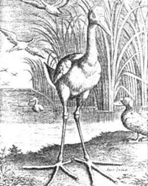 Osobliwy ptaszek, mający ok 1,8 metra wzrostu, bardzo przypomina innego tajemniczego ptaka, przedstawionego na rycinie Adriaana Collaaerta, noszącego niewiele mówiący podpis Avis Indica(Ptak Indyjski)