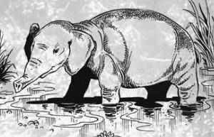 Wiele sporów powstało wokół tajemniczego słonia wodnego z Zairu. Opisywano go jako osobliwe zwierzę dwumetrowej wysokości, o dość krótkich nogach, gładkiej skórze hipopotama, szyi dwukrotnie dłuższej niż szyja zwykłego słonia afrykańskiego i charakterystycznej owalnej głowie bez kłów, z krótką trąbą długości zaledwie 60 centymetrów. Widywano go podobno na bagnach między Jeziorem Mai-Ndombe (dawniej Jezioro Leopolda II) i Tumba. W ciągu dnia ukrywał się w głębokiej wodzie, w nocy natomiast wychodził na brzeg, żeby pożywiać się bujną trawą. Słonie wodne wyraĽnie przypominają budową prehistoryczne dawno wymarłe zwierzęta z rodu słoni, takie jak Phiomia i Moeritherium. Czy to możliwe, że z tego samego pnia wyłoniły się odmiany żyjące dziś w niedostępnych zakątkach? Wiele mitów afrykańskich opowiada o władcach słoni, obdarzonych czterema kłami zamiast dwóch. Słonie o czterech kłach istnieją jednak naprawdę. Najsłynniejszego z nich zabito w Lukuli w Zairze 6 sierpnia 1947 r. Jego czaszkę posłano do Muzeum Konga Beligijskiego w Belgii. Każdy z czterech olbrzymich kłów ważył około 23 kilogramów. Innego słonia o czterech kłach zauważył 10 maja 1917 r. Abdul El-Farag Ali w Sudanie (i wspaniałomyślnie zrezygnował z trofeum myśliwskiego). Przyrodnik Armand Denis widział czaszkę słonia o czterech kłach w Ituń w Zairze. Najdziwniejszy okaz środkowoafrykańskiego słonia o trzech kłach opisał David Livingstone, który zabił zwierzę 1 maja 1870 r. Dodatkowy kieł wyrastał z podstawy trąby zwierzęcia!