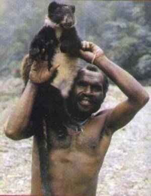 Członek plemienia Irian Jaya z nadrzewnym kangurem, przez tubylców nazywanym "bondegezou". Uważa się, że te niewielkie, do niedawna nie znane nauce zwierzęta przetrwały tylko dlatego, że miejscowe plemiona czciły je jako święte. W innych rejonach nie miały tyle szczęścia - poluje się na nie dla ich mięsa.