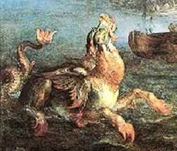Wczesny opis tej olbrzymiej wydry pojawia się w książce pt. "A Description of West Connaught" z 1684 roku, autorstwa Rodericka O'Flaherty'ego. Według autora pewien człowiek spacerował stromym brzegiem jeziora, kiedy nagle zobaczył w wodzie łeb jakiegoś zwierzęcia. Kiedy próbował przyjrzeć się dokładniej, stworzenie zanurkowało i uderzyło z całej siły w brzeg. Skutkiem czego mężczyzna wpadł do wody. Potwór przypominał wielką wydrę, był barwy "zwykłego charta", jednak pozbawiony był owłosienia. Zwierzę wbiło zęby w czaszkę człowieka i wciągnęło go pod powierzchnię wody. Mężczyzna wyciągnął nóż i zadał nim cios stworowi, który zwolnił uścisk i uciekł, zostawiając za sobą smugę krwi.